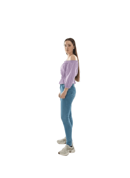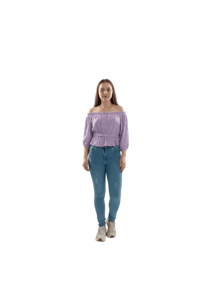 Femenina blusa de color lila con detalle elástico en los hombros y la cintura.